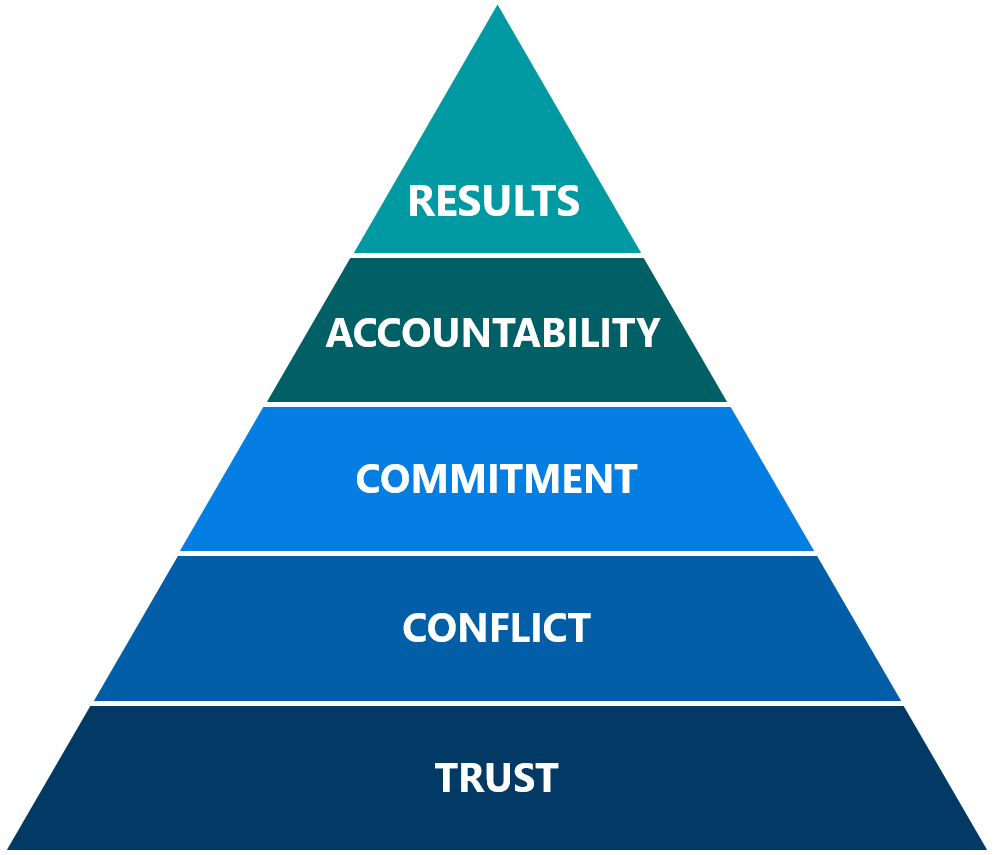 The Five Behaviors® blends Lencioni’s framework for cohesive teams with personalized insights so people can see exactly how their behaviors show up at work. The model focuses on five essentials: Trust, Conflict, Commitment, Accountability, and Results. These behaviors build on each other to create a strong foundation for team effectiveness.
